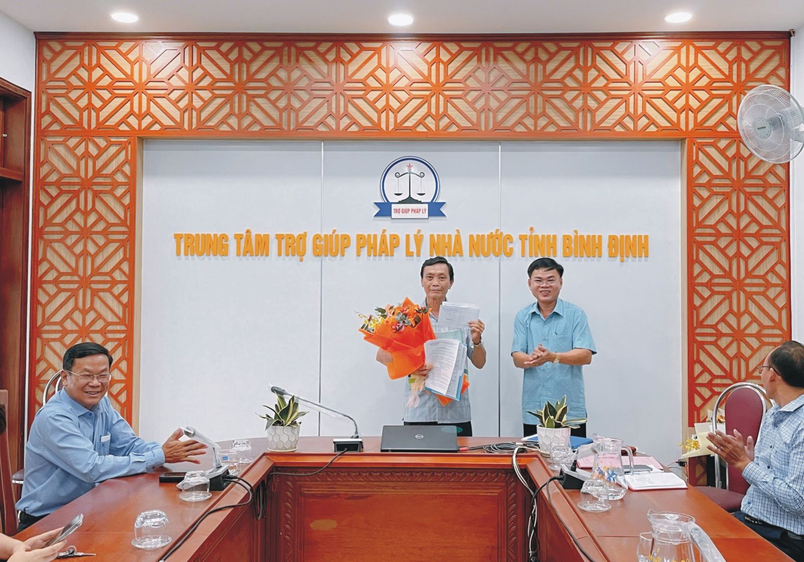 Đồng chí Vinh chụp ảnh kỷ niệm với Lãnh đạo Sở Tư pháp và tập thể Trung tâm TGPLNN tỉnh